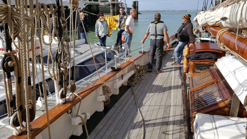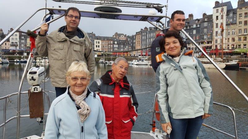 A 8h30 précises, nous passons l’écluse du vieux bassin. Nous sommes les seuls à sortir, le port de Honfleur est encore endormi après les festivités de la veille. Les marins hissent les voiles, et nous sortons d’Honfleur en empruntant la passe des pêcheurs car la hauteur d’eau le permet. C’est quand même un peu délicat, sur l’écran nous lisons une hauteur d’eau qui diminue de plus en plus pour descendre jusqu’à 1m. Il faut vraiment bien connaître cette passe, comme c’est le cas de Jean-Jacques, pour se risquer à l’emprunter. Dépassé Honfleur, le vent du sud-ouest ne tarde pas à se lever, et je découvre alors la complexité d’une bonne navigation. Les marins jouent avec grand voile et génois, j’enrichis mon vocabulaire maritime en comprenant ce que c’est que border, lofer et affaler. Rémi est un excellent second, il a lui-même sillonné les côtes africaines pendant deux ans. Franck est à la barre avec grande efficacité. Le bateau gîte, et je n’ai « même pas peur ». Nous profitons du paysage qui s’offre à nous, une côte vallonnée et verdoyante, où sont nichés Villerville, Trouville sur mer, pour finir à Deauville. Ensuite nous nous éloignons de la côte pour mettre cap sur Ouistreham. A midi cinq, Carole nous prépare comme la veille de délicieuses tartines aux rillettes et Rémi nous sert un ti-punch bien dosé. Nous trinquons à Jonathan, et à la vie de l’association. C’est pour moi un joli moment de camaraderie, et j’oserai dire de belle humanité ! Nous déjeunons au ponton d’attente de Ouistreham, puis c’est l’heure du rangement complet du bateau. En effet, Jonathan vient de faire sa dernière croisière de la saison 2017 , et passera l’hiver au ponton B de Ouistreham. Avant les adieux, nous avons le privilège de discuter avec la navigatrice Claire Pruvot qui avec son bateau classe 40 nommé Calvados, est arrivée à la 6ème place du Normandy channel race de mai-juin dernier. Participer à une croisière sur le Jonathan, c’est aussi aller à la rencontre de gens amoureux de la mer et des bateaux. Et cà j’adore !