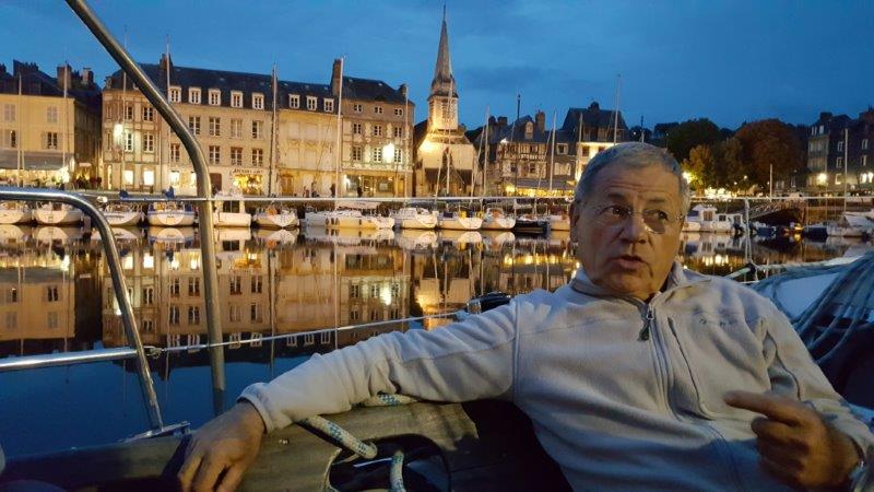 Nous levons l’ancre à 9h pour être en position de départ à l’ouverture des portes de l’écluse. Nous franchissons le chenal, la météo s’annonce bonne. Jean-Jacques met le cap sur Honfleur, la mer est calme et le vent faible, les chevaux du moteur aide le vent dans la grand voile à faire route. Nous pouvons deviner les stations de Dives, Cabourg, Houlgate , Villers et sa falaise des Vaches Noires réputées pour ses fossiles. Nous nous éloignons de la côte pour rejoindre au plus court le port de Honfleur. Quand nous nous positionnons en attente à l’écluse, c’est l’affluence. Nous avons la chance de pouvoir nous amarrer au Marie-Fernand du Havre, un cotre pilote de 15m, construit en 1894 et restauré par des fondus de vieux gréements. Ceux-ci avec qui la conversation s’est engagée nous indique fièrement que le Marie-Fernand est désormais classé Monument historique.