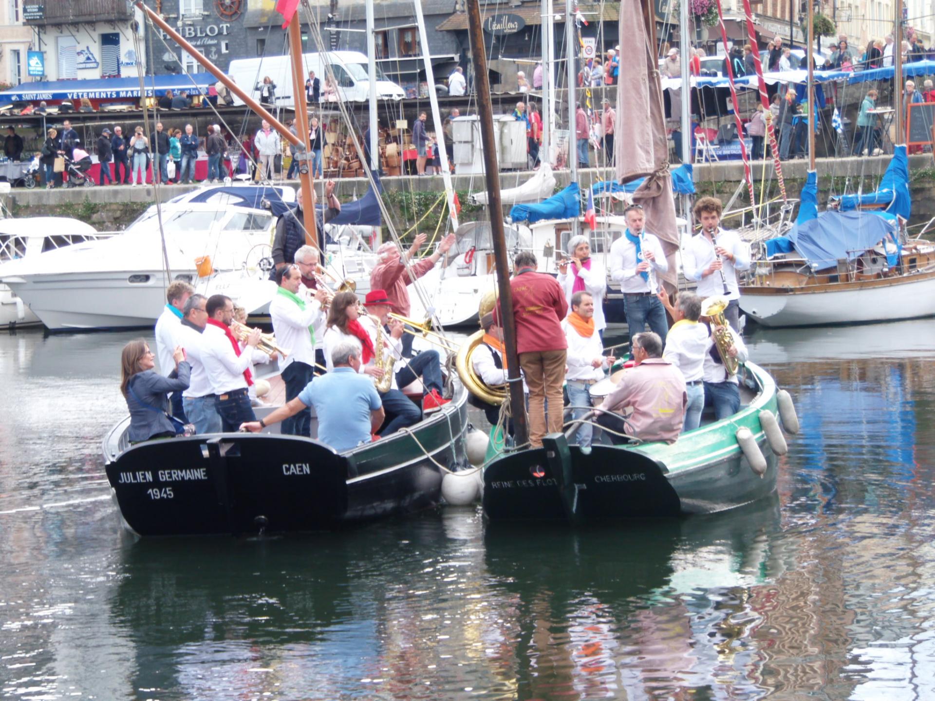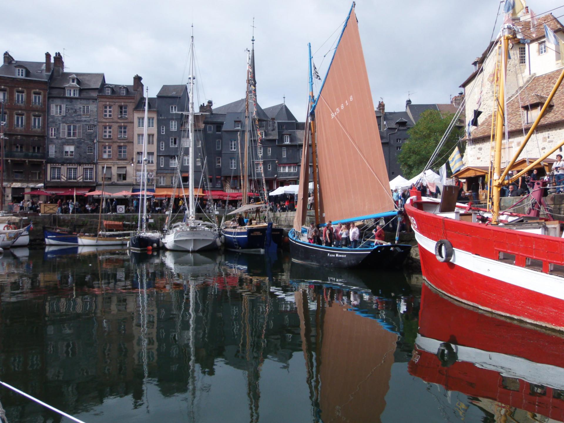 Puis c’est l’entrée grandiose dans le vieux bassin d’Honfleur, une chance que de vivre cela ! Double chance même puisque ce week-end là, a lieu la fête à la crevette, et que pour l’occasion, de nombreux navires sont rassemblés. Jonathan va alors se mettre à couple avec deux vieux gréements. Pour entrer dans la fête, Jean-Jacques hisse au sommet du mât le drapeau normand et le pavois. Nous profitons des animations : défilé d’embarcations avec équipage de musiciens et de gens en costumes normands, baptême de bateaux.